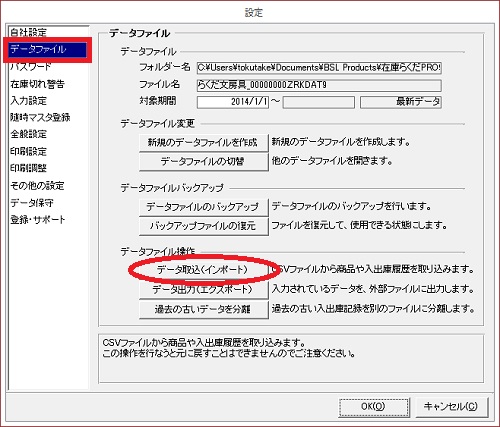 | (2) | 「データファイル」項目をクリックし、[データ取込(インポート)]ボタンをクリックします。 |