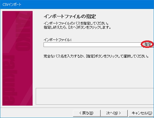 | (5) | 「インポートファイルの指定」画面が表示されます。[指定]ボタンをクリックし、取込元のCSVファイルを指定して、[次へ]ボタンをクリックします。 |