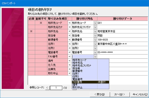 | ※[割り付け列名]欄のコンボボックスには、取込元ファイルの1行目が取り込まれて表示されます。 |
