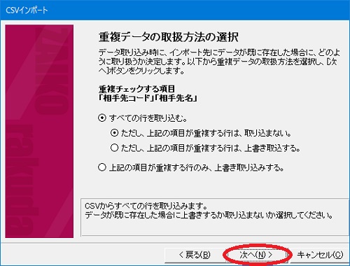 | (8) | 「重複データの取扱方法の選択」画面が表示されます。「重複チェックする項目」にある項目と一致するデータが存在した場合、上書き取込するか等を選択し、[次へ]ボタンをクリックします。 |