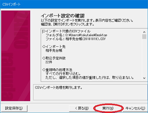 | (9) | 「インポート設定の確認」画面が表示されます。[実行]ボタンをクリックします。 |
