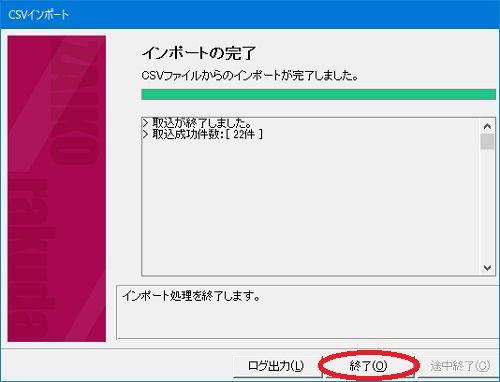 | (10) | 「インポートの完了」画面が表示されます。全データが取り込み成功していれば、[終了]ボタンで終了します。 |