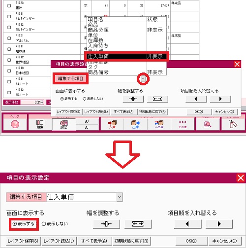 | (2) | 「項目の表示設定」画面が表示されます。[編集する項目]で表示したい項目を選択し、[画面に表示する]の中で[表示する]を選択します。 |