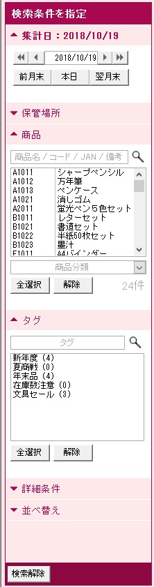 | 「在庫確認」「伝票一覧」「入出庫帳」等の画面で表示内容を絞り込むには、以下の手順で行います。 |