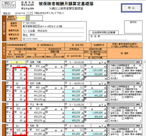 | 算定基礎届の基礎日数は、各月の暦日数を表示する仕様となっています。明細書の勤務日数は反映されません。 |