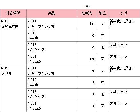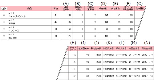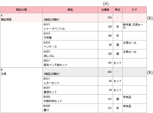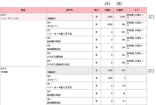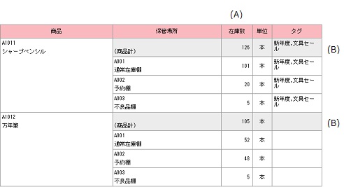 | (A) | 在庫数: 集計日時点の在庫数を表示します。 |