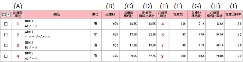 | (E) | 在庫数順位: 集計期間末時点の[在庫数]に基づいて順位を表示します。[出庫数順位]が高くても[在庫数順位]が高い商品は過剰在庫の可能性があります。 |