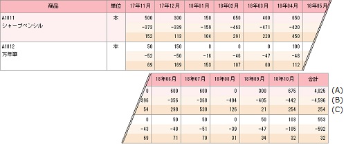 | 商品別に月ごとの入庫数合計・出庫数合計・月末在庫数を集計します。12ヵ月以内であれば列を非表示にすることにより半年・四半期等の期間集計表にすることもできます。 |