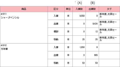 | (A) | 繰越在庫数: 集計期間直前までの在庫数を表示します。 |
