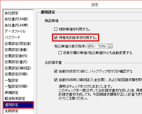 | (2) | [運用設定]内にある[得意先別掛率を利用する。]にチェックをつけ、[OK]ボタンをクリックします。 |