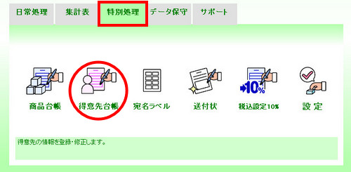 | (1) | メインメニューの[特別処理]タブをクリックし、[得意先台帳]アイコンをクリックします。 |