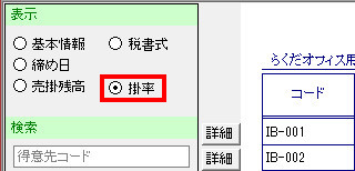 | (2) | 「得意先台帳」画面左下の[検索]ボタンを押し下げ、画面左上に表示される[表示]の中から「掛率」を選択します。 |