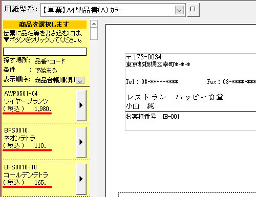 | 掛率を設定した後、伝票を作成すると、登録されている商品を呼び出す際、宛先に設定された得意先に応じて単価が変わります。 |