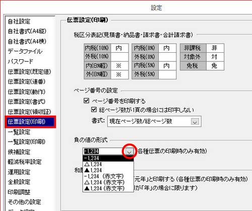 | (2) | [伝票設定(印刷)]内にある[負の値の形式]を「△1,234」または「▲1,234」にし、[OK]ボタンをクリックします。 |