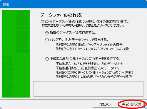 | (2 | -3)画面に従って進み、「データファイルの作成」画面が表示されたら[キャンセル]ボタンをクリックします。 |
