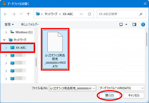 | (2 | -5)データファイル指定のダイアログボックスが表示されますので、(1-4)で指定した場所にあるデータファイルを選択し、[開く]ボタンをクリックします。 |