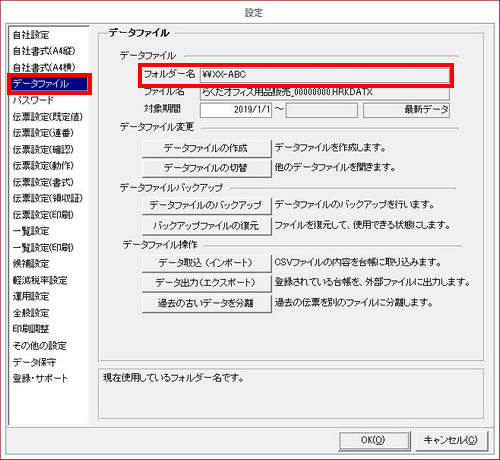 | (2 | -7)「設定」画面で[データファイル]をクリックし、「フォルダー名」欄の表示が(1-4)および(2-5)で指定したフォルダーと同じ場所になっていることをご確認ください。 |