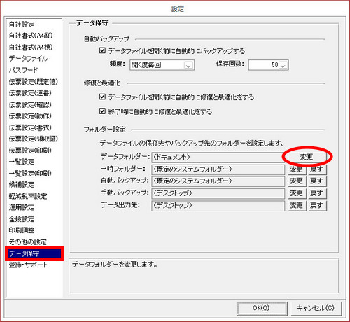 | (2 | -8)続けてデータフォルダーの設定を変更します。「設定」画面の「データ保守」をクリックし、「フォルダー設定」の中にある「データフォルダー」欄の[変更]ボタンをクリックします。 |