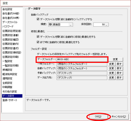 | (2 | -12)「設定」画面で、「データフォルダー」欄が(2-5)で指定した場所と同じになっていることを確認し、[OK]ボタンをクリックします。 |