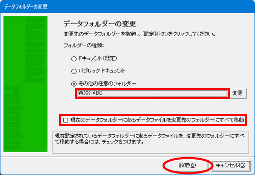 | (1 | -5)「その他の任意のフォルダー」の欄に選択したフォルダーが表示されていることを確認し、「現在のデータフォルダーにあるデータファイルを変更先のフォルダーにすべて移動」にチェックを付けて、[設定]ボタンをクリックします。 |