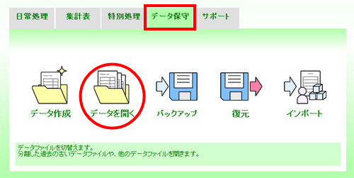 | (2 | -8)メインメニューが表示されますので、[データ保守]タブをクリックし、[データを開く]アイコンをクリックします。 |