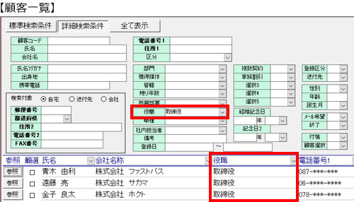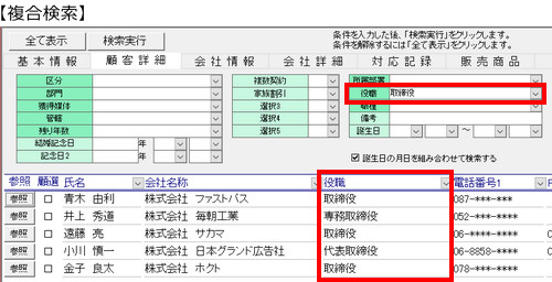 | 例えば、[役職]の検索を行う際、検索条件に「取締役」と指定した場合、顧客一覧では「取締役」と入力された顧客のみが対象となり、「代表取締役」等の「取締役」を含んだ顧客は対象外となりますが、複合検索では「代表取締役」等の「取締役」を含んだ顧客も対象として絞り込まれます。 |