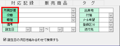 | ※「顧客らくだプロ8.5/9」、「かるがるできる顧客6.5」以降では、部分一致で検索される項目の名称部分が濃い緑色になっています。 |