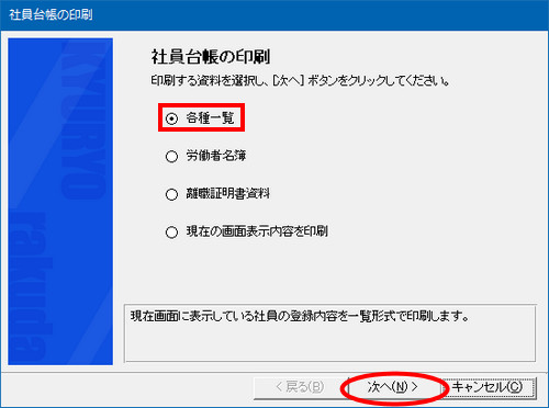 | (3) | 「社員台帳の印刷」画面が表示されますので、[各種一覧]を選択し、[次へ]ボタンをクリックします。 |
