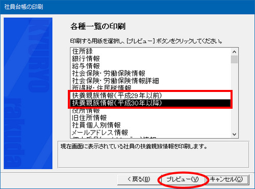 | (4) | 「各種一覧の印刷」画面が表示されますので、「扶養親族情報」を選択し、[プレビュー]ボタンをクリックします。 |