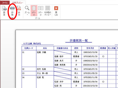 | (5) | 「扶養親族一覧」の印刷プレビュー画面が表示されますので、[印刷]ボタンから印刷を実行します。 |