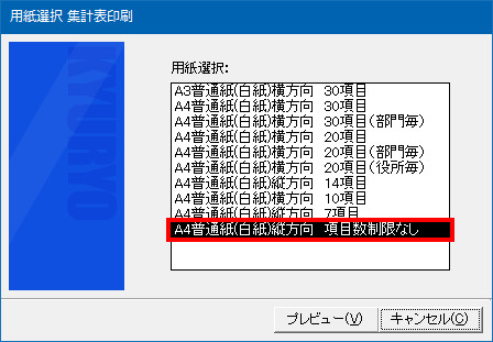 | 「支給控除一覧」等の集計表で、画面上では列方向が項目、行方向が社員になっていますが、[印刷]ボタンをクリックして表示される「用紙選択 集計表印刷」画面で、「A4普通紙(白紙)縦方向 項目数制限なし」を選択すると、列と行が反対になった集計表を印刷することができます。 |