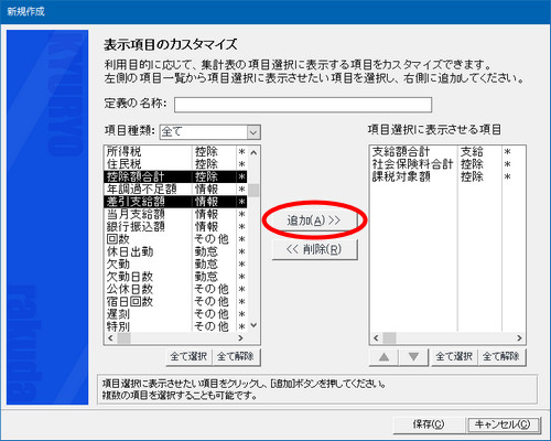 | 賃金台帳・支給一覧・控除一覧・支給控除一覧・勤怠一覧の各集計表では、「表示項目のカスタマイズ」機能を使用して、表示する項目・並び順を、ユーザー定義として保存(登録)しておき、必要に応じて登録したパターンを呼び出すことができます。 |