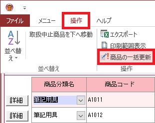 | (2) | 画面上部の[操作]メニューをクリックし、[商品の一括更新]をクリックします。 |