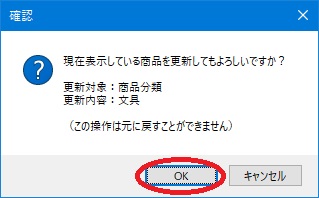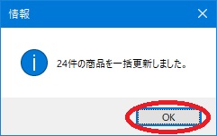| (7) | 「○件の商品を一括更新しました。」という確認メッセージが表示されますので、[OK]ボタンをクリックします。 |