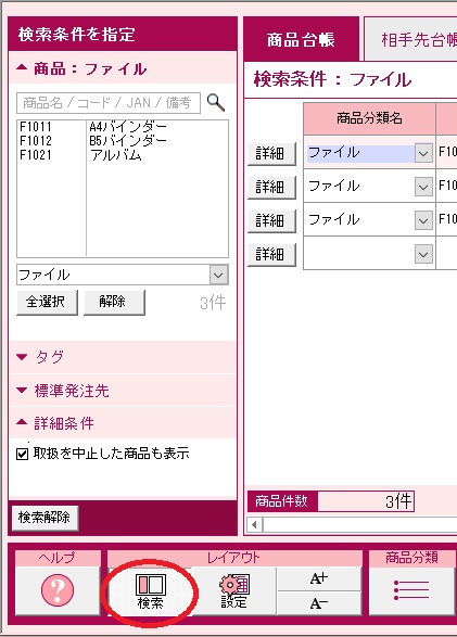 | ※「商品分類」「単位」「標準発注先」の変更内容は、それぞれ商品分類台帳、単位台帳、相手先台帳に登録されている名称から選択します。台帳に登録されていない名称には変更できません。 |