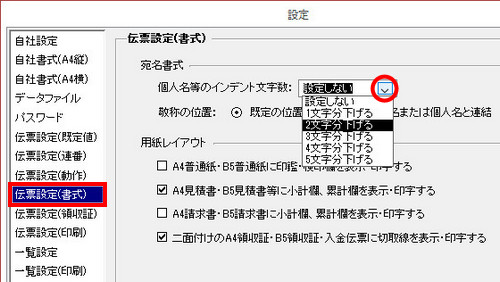 | (2) | 「設定」画面で[伝票設定(書式)]内にある、[個人名のインデント文字数]を「1文字分下げる」から「5文字分下げる」の範囲内で設定します。 |
