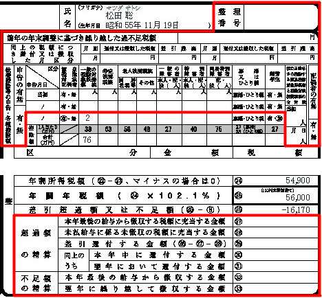「給与所得に対する源泉徴収簿」(給与所得・退職所得に対する所得税源泉徴収簿)では、以下の赤枠に囲われている部分には印刷を行うことはできません。該当箇所につきましては手作業による記入をお願いいたします。