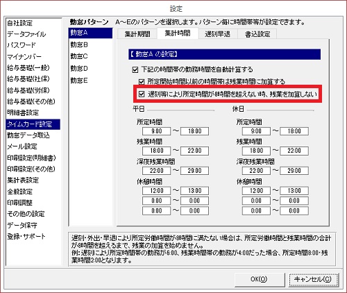 | (3) | [遅刻等により所定時間が8時間を超えない時、残業を加算しない]にチェックを付けます。 |