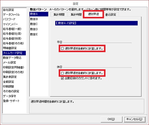 | ※遅刻・早退を自動計算する必要がない場合は、[遅刻早退](または[早出/遅刻])タブ内の[遅刻早退を自動的に計算します。]のチェックを外してください。 |
