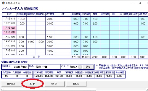 | (4) | 「タイムカード入力」画面で、下部にある[更新]ボタンをクリックします。 |