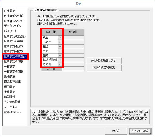 | あらかじめ用意されている「現金・小切手・振込・手形・相殺・振込手数料・その他」以外を設定したい場合は、[内訳の内容を編集]ボタンをクリックし、「内訳を編集します。」画面で、追加の登録を行います。 |