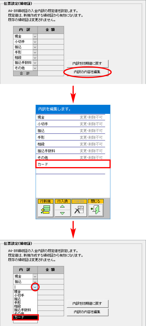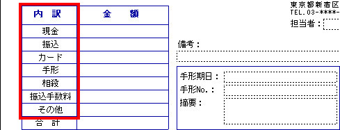 | 上記の手順で設定を行った後、領収証(入金伝票)を新規作成して、[内訳]欄に設定が反映されていることをご確認ください。 |