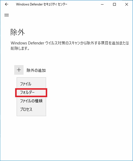 | (6) | 「除外の追加」の「+」をクリックし、「フォルダー」をクリックします。 |