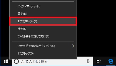 | (1) | Windowsのスタートボタンを右クリックして、表示されるメニューから「エクスプローラー」をクリックします。 |