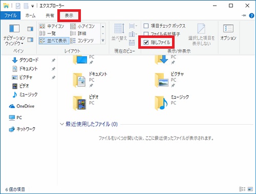 | (2) | エクスプローラー画面上部の「表示」をクリックし、「隠しファイル」をクリックしてチェックを入れます。 |