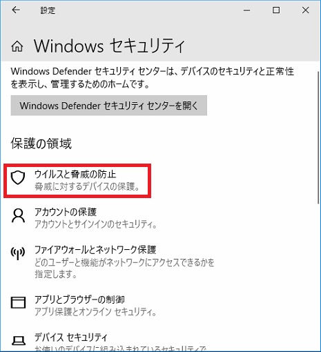 | (3) | 「Windowsセキュリティ」項目内の「ウイルスと脅威の防止」をクリックします。 |