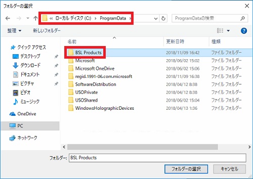 | 「コンピュータ」→Cドライブ→「Program Data」→「BSL Products」 |