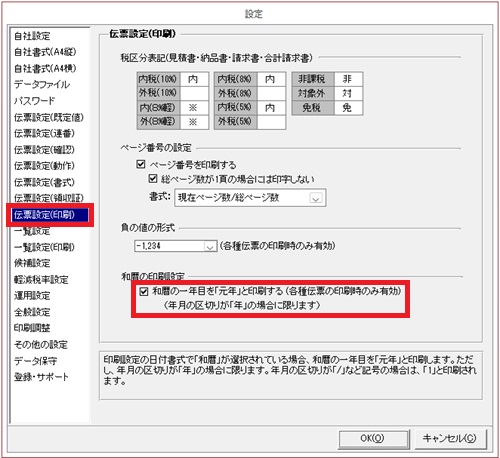 | (2) | [伝票設定(印刷)]項目をクリックし、「和暦の一年目を「元年」と印刷する(各種伝票の印刷時のみ有効)」のチェックボックスにチェックを入れます。 |