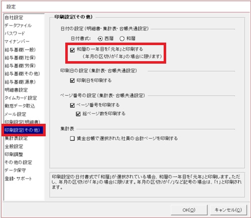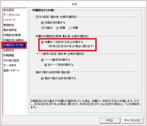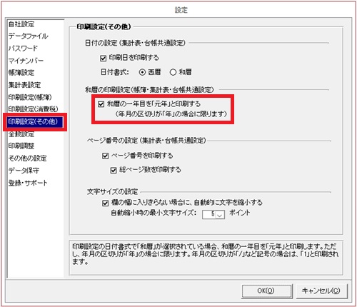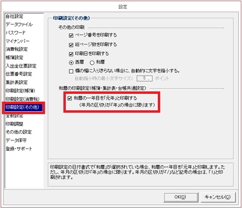 | (2) | [印刷設定(その他)]項目をクリックし、「和暦の一年目を「元年」と印刷する」のチェックボックスにチェックを入れます。 |