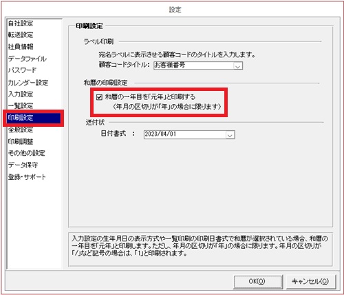 | (2) | [印刷設定]項目をクリックし、「和暦の一年目を「元年」と印刷する」のチェックボックスにチェックを入れます。 |